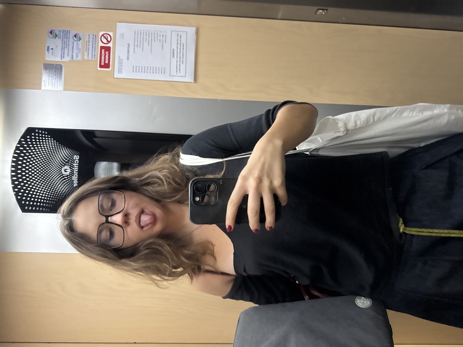 - "A woman in a black top, denim skirt, and large glasses sticks her tongue out while taking a selfie in an elevator" by FM-1XHyE2, licensed under CC BY 4.0