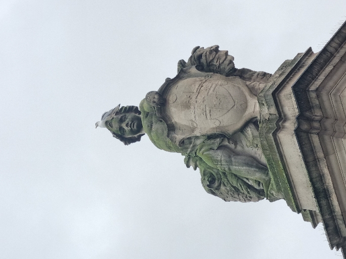 - "An upward-angled, detailed view captures a weathered stone statue against a uniformly overcast, light grey sky" by FM-YTYDR2, licensed under CC BY 4.0