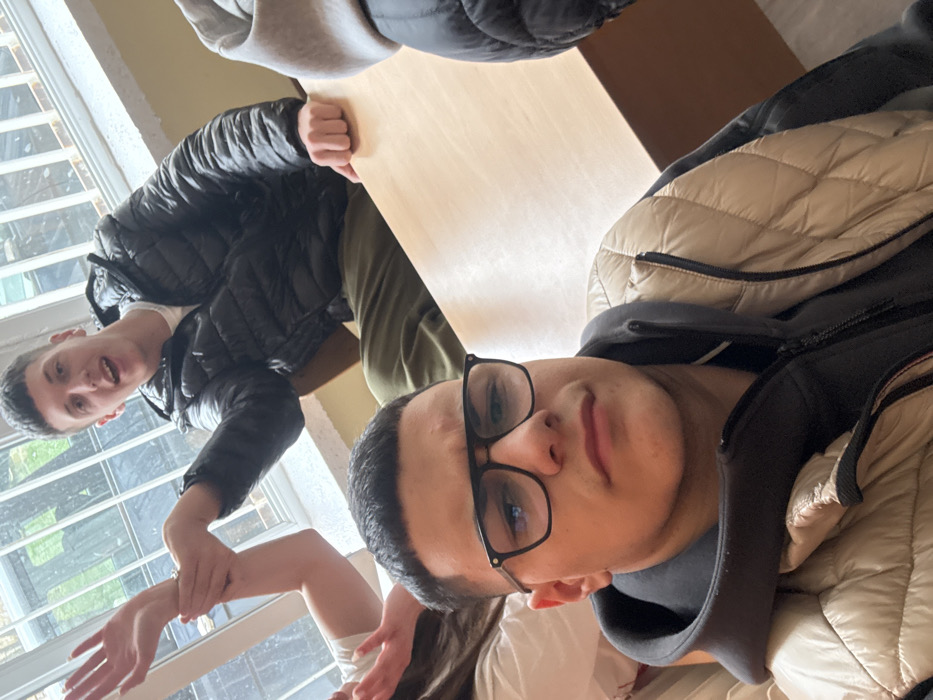 The image depicts an indoor scene, likely a classroom or educational facility, in the city of Unknown, Unknown. Three individuals are visible. In the immediate foreground, a male with short dark hair and dark-framed glasses wears a dark hooded jacket and a light beige quilted vest, looking directly at the camera. Behind him and to the right, a second male with short dark hair, wearing a black quilted jacket and olive-green pants, is seated at a light wooden desk, facing the camera with his mouth open. His left hand grasps the right wrist of a third individual, whose arm and a hand in a white long-sleeved garment are visible to the left. The third individual's other hand is partially visible, appearing to gesture near their upper torso. A light wooden desk spans the mid-ground. In the background, large windows with white sills reveal a view outside, partially obscured by what appears to be a metal grille or bars, allowing natural light into the room. A chair back is partially visible behind the second male.