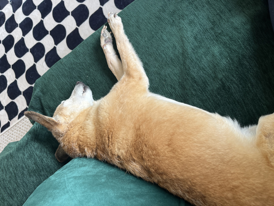 - "A light brown domestic dog is depicted lying asleep on its left side, positioned on a dark green upholstered sofa or cushion" by FM-TZcKC2, licensed under CC BY 4.0