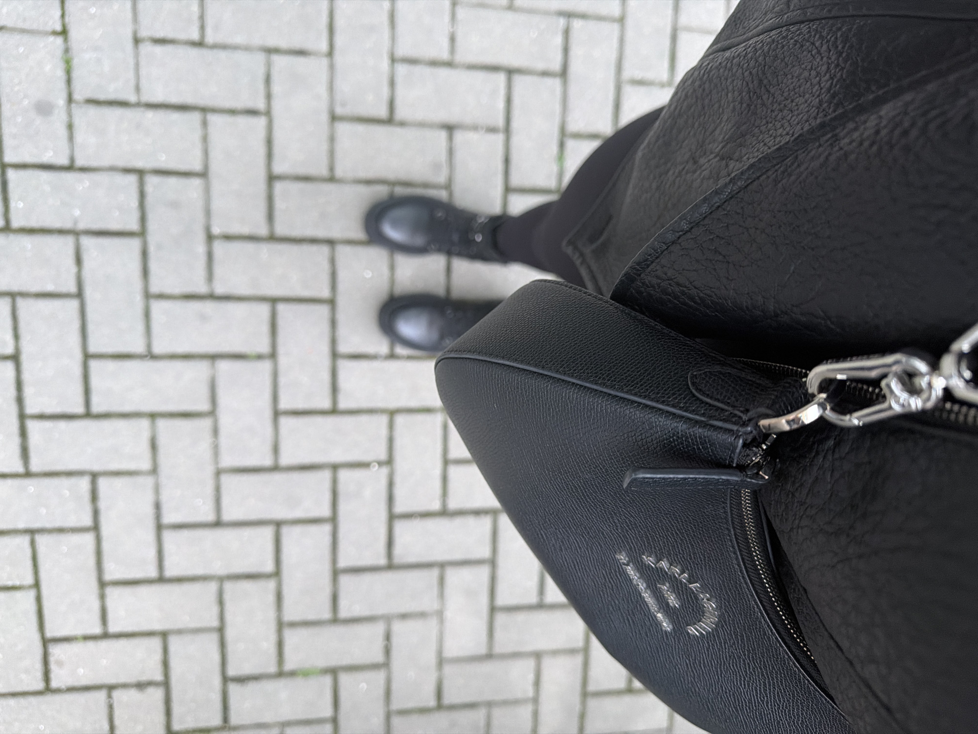 A high-angle shot shows a person standing on a paved walkway. The walkway is constructed of rectangular, light gray paving stones arranged in a herringbone pattern. The person is wearing black leggings and black boots, with the feet visible in the upper-middle of the frame. A black leather jacket and black leather handbag with silver hardware are prominently displayed on the right side of the image. The handbag has a visible logo in the lower right corner. The environment is outdoors, and the lighting suggests a cloudy day. The location cannot be determined to be in Varna, Bulgaria, from the given image.