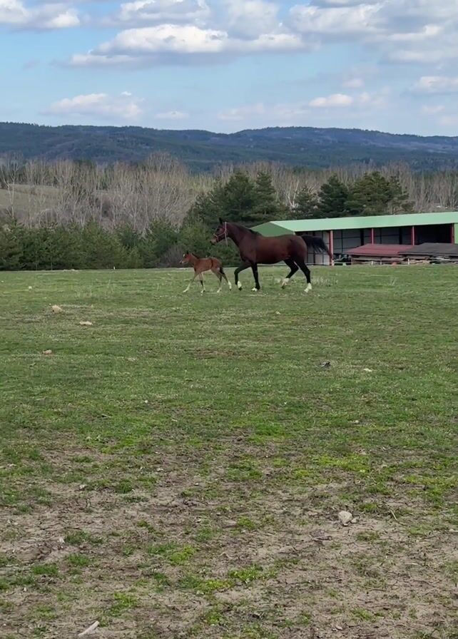 brown mare and her foal trotting in a grassy field on a partly cloudy day