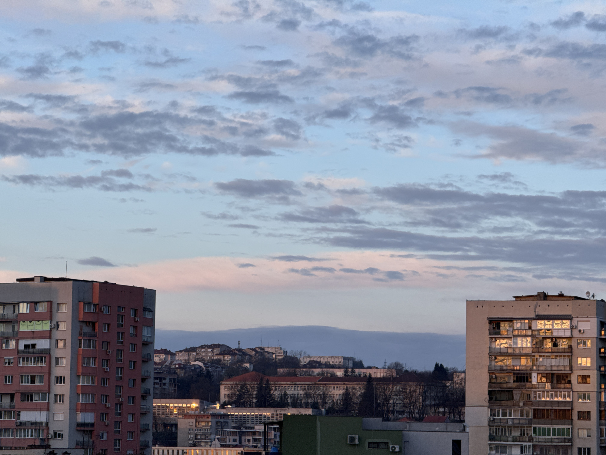 The image presents a cityscape under a sky filled with clouds, possibly at dusk or dawn. Two tall apartment buildings dominate the foreground, framing a view of the city of Pleven, Bulgaria. The building on the left is painted in hues of pink and gray, while the building on the right is lighter, with windows reflecting sunlight. In the space between these buildings, one can discern a lower cityscape with buildings of varying sizes and colors, as well as trees. In the background, a hill can be seen, dotted with structures and vegetation. The sky is filled with gray and white clouds against a blue backdrop.