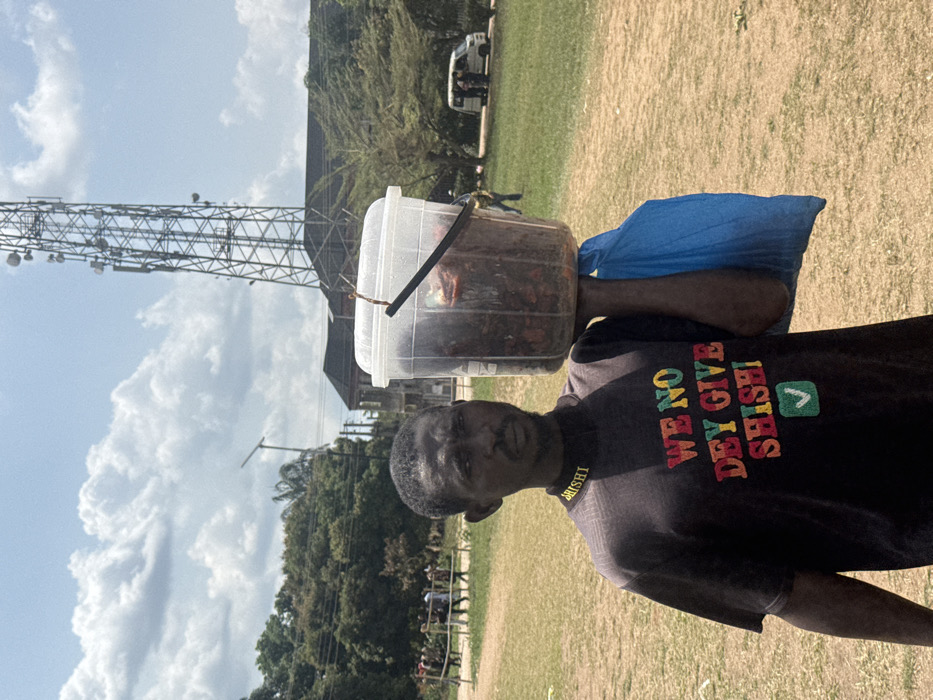 A male individual stands in an open, grassy field in Ihiagwa, Nigeria, under a partly cloudy sky. He is dark-skinned, with a short beard and mustache, looking directly at the camera. He wears a black short-sleeved mock-neck t-shirt. The collar features yellow embroidery spelling "ARISHI." The chest of the t-shirt displays multi-colored text: "WE NO DEY GIVE SHISHI!" followed by a green checkmark icon. He holds a clear plastic bucket filled with dark, granular contents, resting on his left shoulder. A blue plastic bag hangs from the bucket's handle. In the background, a tall metal lattice communications tower rises prominently. To the left of the tower, a building with a dark roof and light-colored walls is visible. Further left, a group of people walk in the distance near dense green foliage. To the right of the tower, a white van or mini-bus is parked, with several individuals standing nearby. The ground is primarily covered in short, slightly dry grass.