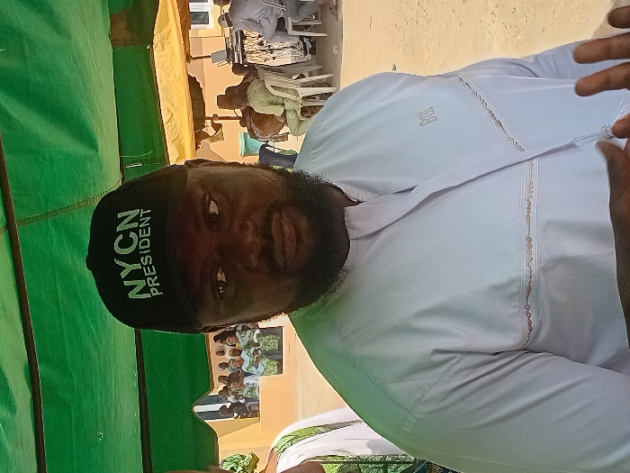 A man wearing a white traditional shirt and a black hat labeled "NYCN PRESIDENT" is the primary focus. He has a beard and is looking towards the camera. In the background, a gathering of people is visible, partially obscured by green draped material. Several individuals are seated on white chairs under a covered area, with some wearing traditional attire. The setting appears to be an outdoor event.