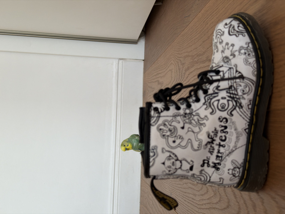 An indoor scene, presumably within a residence in Grad Rijeka, Croatia, displays a single white Dr. Martens boot on a light brown wooden floor. The boot, featuring black laces and a yellow-stitched black sole, is customized with black line art drawings depicting various cartoonish figures, creatures, and abstract designs. The brand name "Dr. Air Wair Martens" is visibly written on the side of the boot. A small, green and yellow ceramic or plastic figurine resembling a parakeet is situated within the top opening of the boot, with its head and upper body visible above the rim. The background consists of a plain white wall with a white baseboard, and a partial view of a light-colored door or cabinet frame is visible on the far right.