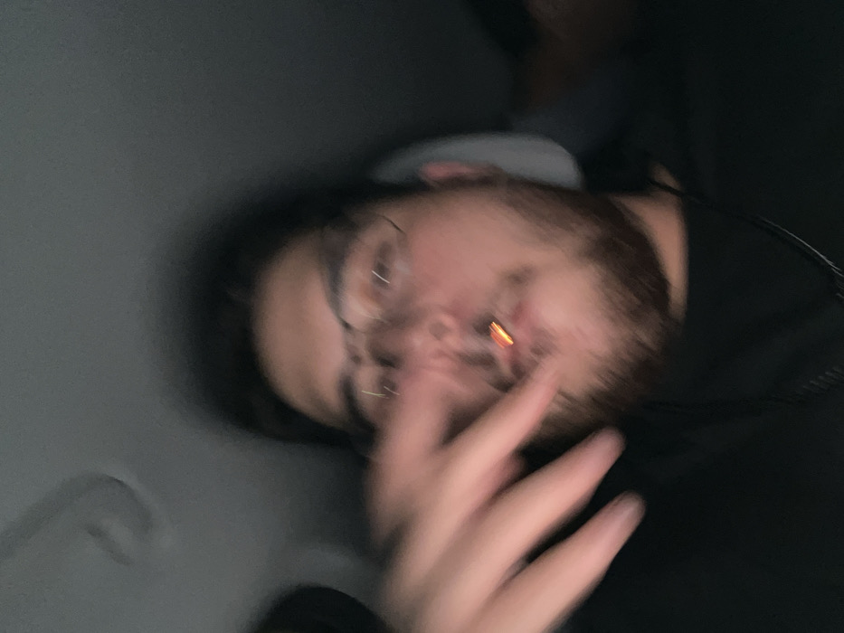 A blurry, low-light image depicts a male individual inside a vehicle. The man, with a beard and eyeglasses, wears dark clothing and a dark cord necklace. A lit, cylindrical object, consistent with a cigarette, is held between his fingers or at his mouth, its tip glowing orange. A blurred hand is visible near the object. The vehicle interior, including a light gray headliner and a grab handle, is visible in the upper left. The specific location within Holon, Israel, is not discernible from the image content.