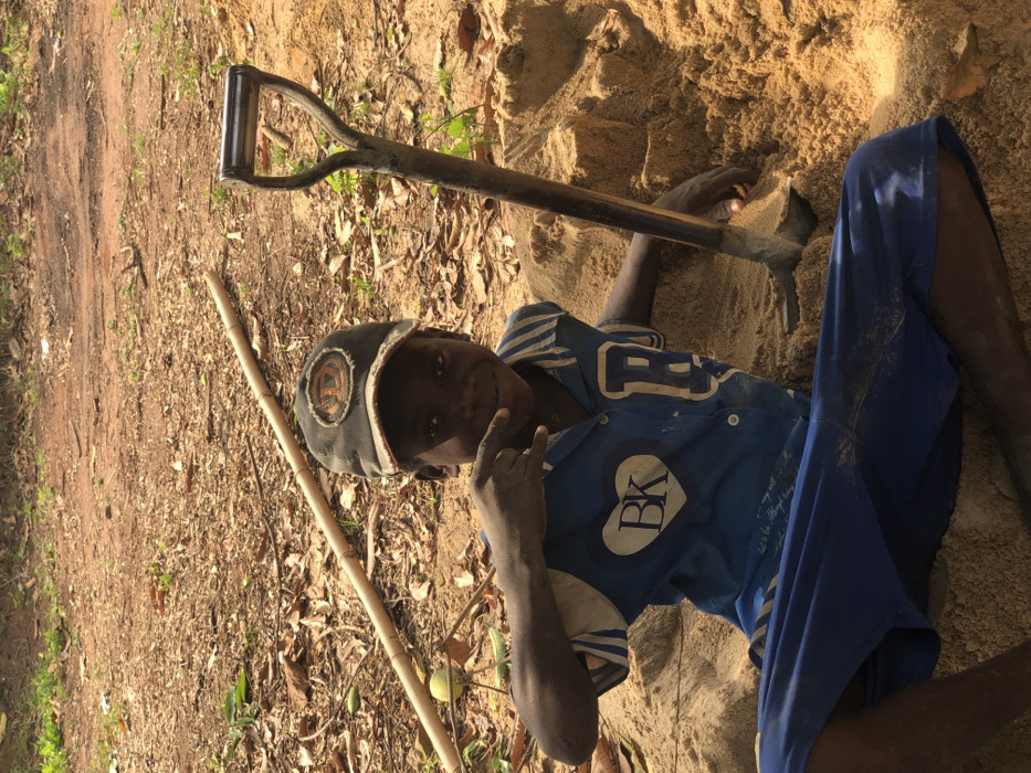 A young male individual, appearing to be a child, is depicted outdoors in the city of Alor, Nigeria. The subject is seated in a mound of light yellowish-brown sand. He wears a dark baseball cap with a circular light-colored emblem on the front, a blue short-sleeved collared shirt with white stripes on the sleeves, a white heart outline containing the letters "BK" on the left chest, and a large white "R" on the right side. Blue shorts complete his attire. His face is directed towards the camera, displaying a smile, and his right hand (viewer's left) is raised, forming a "rock on" gesture with the index and pinky fingers extended. To his right, a dark-colored spade with a D-handle is partially embedded in the sand. The background features reddish-brown earth covered with scattered dry leaves and sparse green vegetation. A light-colored wooden pole lies horizontally on the ground in the mid-background, and a small, light green, spherical object is visible on the ground to the left of the subject's head. The scene is illuminated by natural daylight.