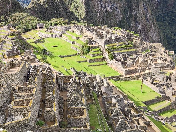 The image depicts the ancient Incan city of Machu Picchu, nestled high in the Andes Mountains. Stone structures with gabled roofs form orderly rows, separated by narrow walkways. Expansive green terraces cascade down the hillside, interspersed with ruins. The backdrop features lush, steep mountains, partially shrouded in mist. The city's intricate stonework and strategic location illustrate the ingenuity of the Incan civilization.