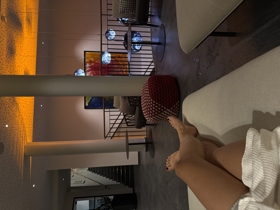 A woman relaxes on a white couch, her bare legs and feet visible. A red and white knitted pouf sits nearby. The modern interior features a staircase, artwork on the wall, and hanging spherical lights. The setting appears to be a hotel or spa lobby with a polished, contemporary design. The lighting creates a warm and inviting atmosphere.