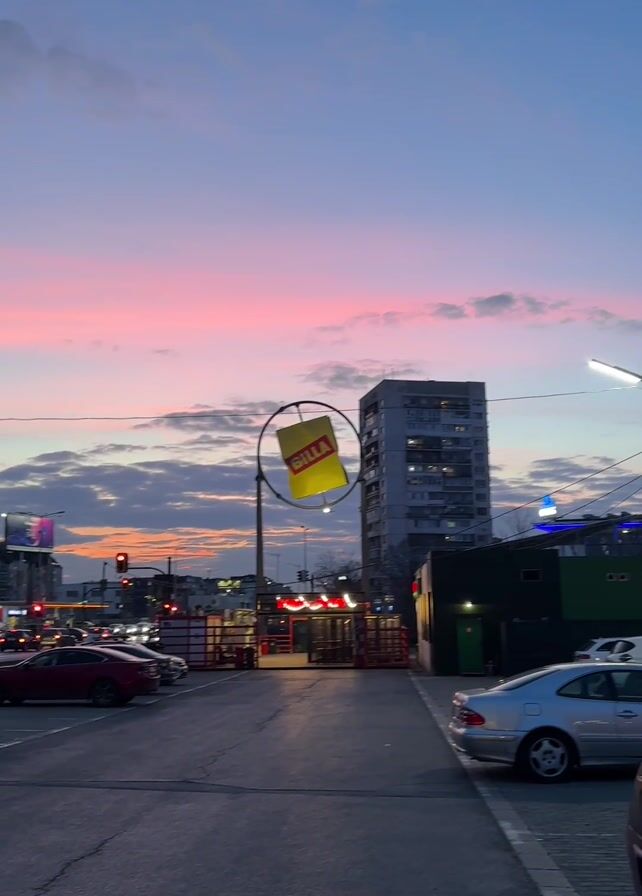 The scene captures a parking lot with various cars and a "BILLA" supermarket sign in the foreground. In the background, a dense urban environment unfolds under a vibrant sunset sky painted with shades of blue, pink, and gray. Buildings of various heights are scattered across the horizon. There is a traffic light in the background, showing a red light. The time is likely late afternoon or early evening.