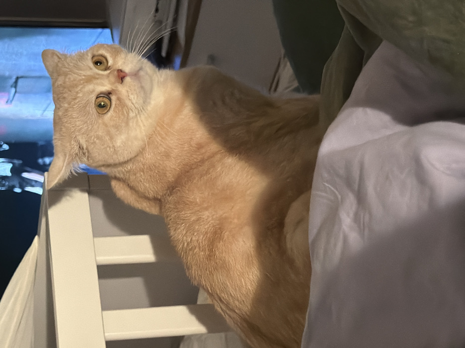 A light orange cat with round, golden eyes sits on a white, slatted structure, possibly a crib or chair