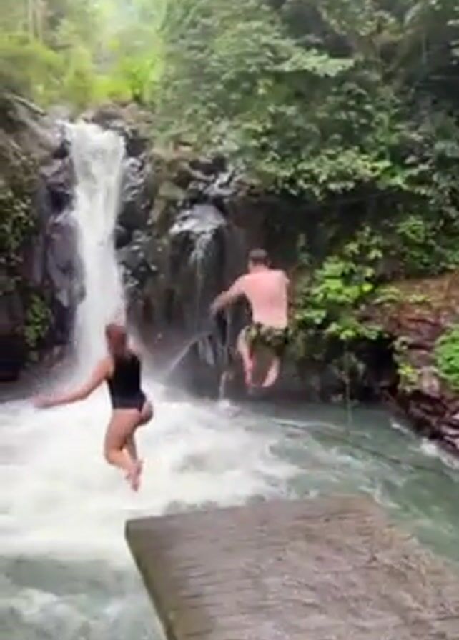 Two people stand on a concrete platform in front of a waterfall. The waterfall is surrounded by lush green vegetation. The person on the right jumps into the water. The person on the left hesitates. The video then focuses on the waterfall and pool.