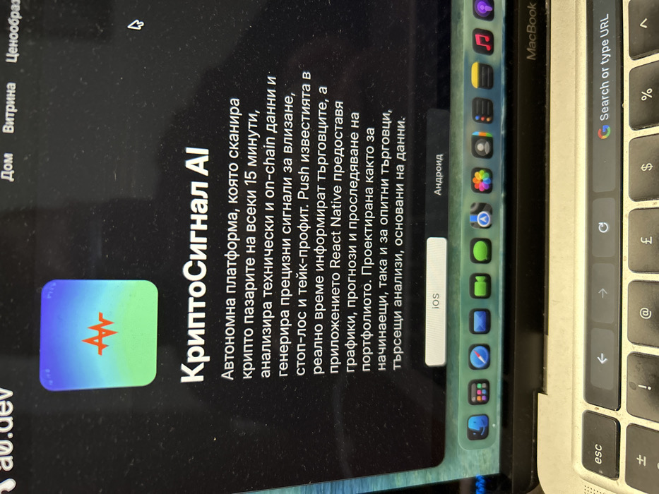 The image presents a close-up, slightly angled view of a silver MacBook laptop, focusing on its screen and the upper portion of its keyboard. The screen displays a webpage with text predominantly in Bulgarian. In the top-left corner, the partial domain "a0.dev" is visible. To the top-right, truncated navigation links in Bulgarian include "Дом" (Home), "Витрина" (Showcase), and "Ценообразу" (Pricing). The central content area features a square application icon with rounded corners, displaying a prominent red waveform graphic against a vertical blue-green gradient background. Directly beneath this icon, the title "КриптоСигнал AI" (CryptoSignal AI) is displayed in large white text. A detailed paragraph of text in Bulgarian follows, describing the platform as an autonomous system designed to scan crypto markets every 15 minutes, analyze technical and on-chain data, and generate precise signals for entry, stop-loss, and take-profit. It states that push notifications inform traders in real-time and that the React Native application provides graphs, forecasts, and portfolio tracking, suitable for both novice and experienced traders seeking data-driven analysis. Below this descriptive text, two rectangular buttons are visible, labeled "iOS" and "Андроид" (Android) respectively. At the very bottom of the screen, a macOS Dock is visible, containing a row of application icons including Safari, Mail, FaceTime, Messages, Apple Maps, Photos, Contacts, Notes, Reminders, Music, and Podcasts. The lower portion of the image shows the physical MacBook keyboard, displaying keys such as "esc," left and right arrow keys, and symbol keys including "@", "£", and "$". The "MacBook" brand name is inscribed on the laptop's chassis above the keyboard. A partial "Search or type URL" input field from a web browser is visible on the screen, overlaying the top edge of the physical keyboard. While the presence of the Bulgarian language on the screen content indicates a connection to Bulgaria, no visual elements within the image itself—such as landmarks, street signs, or unique architectural features—provide forensic evidence to pinpoint the specific geographic location within the city of Sofia or any other precise point.