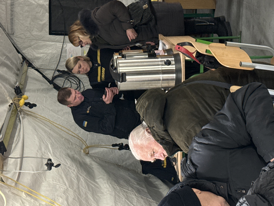 The image depicts an indoor scene within a white canvas tent, serving as a temporary shelter or aid station in Kyiv, Ukraine