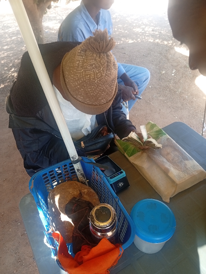The scene depicts an outdoor gathering in Kwang, Nigeria, featuring three individuals and various items displayed on a dark table