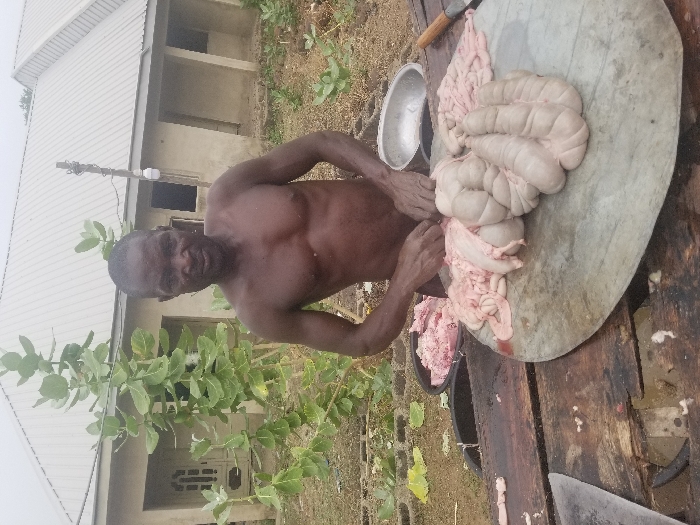 man standing outside, wearing no shirt, in front of a wooden table. He is butchering animal intestines with his hands. He appears to be cleaning and preparing them for cooking or sale. The intestines are laid out on a round wooden surface in front of him, along with other meat pieces in a black bowl. The man appears to be looking directly at the camera. In the background, two unfinished buildings are partially visible, along with a small green tree and some greenery in the surrounding area. The scene is likely a residential or agricultural setting in Pati Ridge, Nigeria. The image suggests that the man is involved in traditional food preparation or trade.