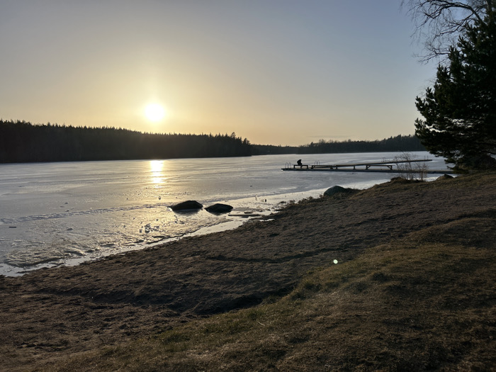 The image displays an outdoor scene at Fjällnora, Sweden, under a low sun, consistent with either sunrise or sunset. A large body of water, likely a lake, extends from the mid-ground to the distant horizon, primarily covered in a layer of ice. The sun, a bright golden orb, is situated low above the distant treeline, projecting a strong, shimmering reflection across the icy surface. In the immediate foreground, a brown, sparsely vegetated earthen bank slopes down to a dark, sandy shoreline. Two dark, irregular stones are visible at the water's edge, resting partially on the ice. A wooden pier extends from the right side of the shore into the frozen lake. A solitary human figure is seated at the far end of the pier, silhouetted against the illuminated ice, facing away from the viewer towards the lake. The distant bank is densely forested with dark evergreen trees, forming a continuous silhouette against the bright sky. The trunk and lower branches of a conifer tree are partially visible on the extreme right of the foreground.