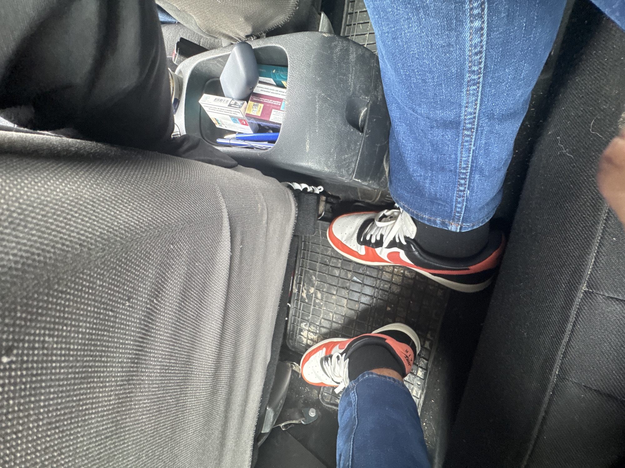 interior of a vehicle, likely a car, from an overhead perspective. Two people are visible from the knees down. The person on the left is wearing gray pants, while the person on the right is wearing blue jeans. Both are wearing black socks and similar athletic shoes that are white with red and black details. The car interior is gray and black. A center console is between the passengers and contains cigarettes and a pen. The floor of the car is a black, patterned rubber mat. The location of Брусовeте, Bulgaria is not discernible in the image.
