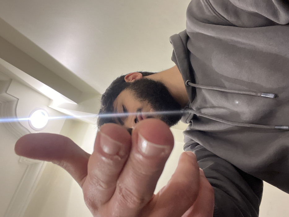 An extreme low-angle shot shows a person wearing a gray hoodie, with the hood's drawstrings visible. The individual has a beard, and their hand is extended towards the camera, fingers outstretched and nails neatly trimmed. A bright light fixture is visible in the background near a white wall. The composition is dominated by the hand and the hoodie, creating a sense of perspective and depth.
