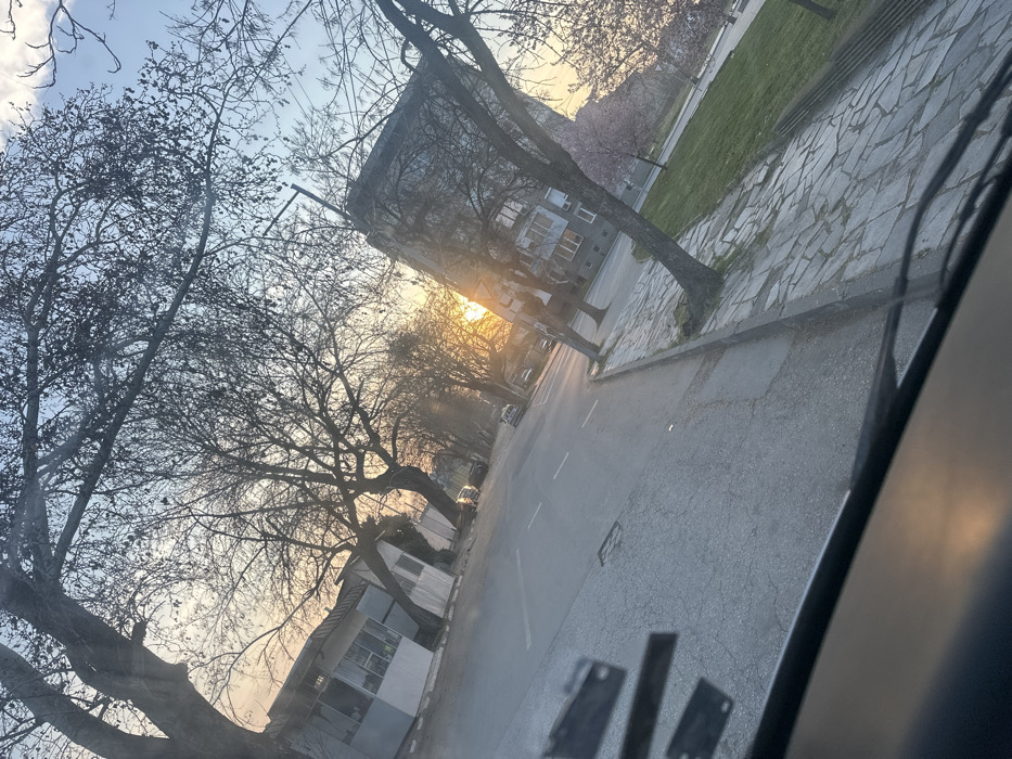 The image depicts a street scene in the city of Stamboliyski, Bulgaria, captured from within a vehicle, with a significant tilt to the left. The sun is low on the horizon, likely sunset or sunrise, creating a bright orange glow and lens flare that dominates the center-right of the frame. The sky transitions from light blue at the top to warm orange and yellow near the horizon. An asphalt road occupies the mid-ground, featuring visible white lane markings, including a double solid white line. Several parked vehicles are discernible further down the street on the left. To the right of the road, a sidewalk paved with irregular stone slabs runs parallel to the street. Beyond the sidewalk, there is a grassy area with numerous trees, including one with light pink blossoms, suggesting early spring. Deciduous trees with bare branches line both sides of the street, many silhouetted against the bright sky. On the left side of the street, several low-rise buildings with light-colored facades and multiple windows are visible. On the right, beyond the trees and sidewalk, a multi-story residential building with a darker facade and numerous rectangular windows stands prominently. No individuals are visible, and no specific actions or interactions are occurring. The lower portion of the image shows the dark interior dashboard or windshield reflection of the vehicle from which the photograph was taken.