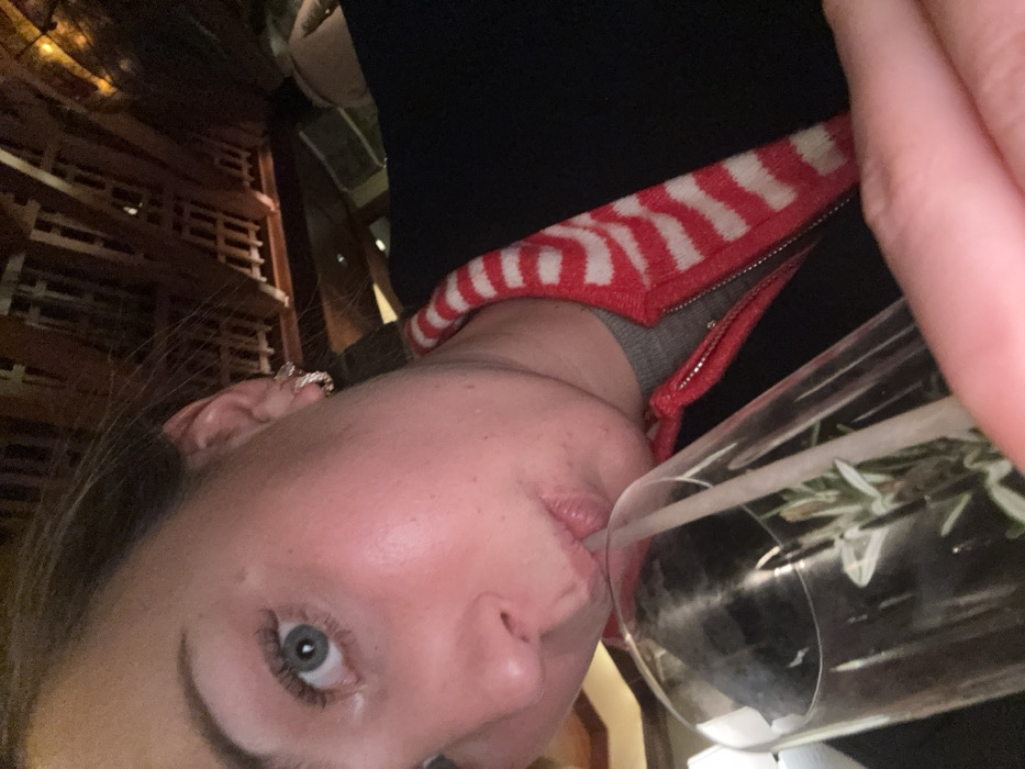 A woman with pale skin and blue eyes drinks from a tall glass through a straw. The glass has greenery inside. She wears a black top with a red and white striped collar over a gray undershirt. A wine rack is visible in the background. She has multiple rings in her ear. The photo is taken at an awkward angle, looking up at the woman.