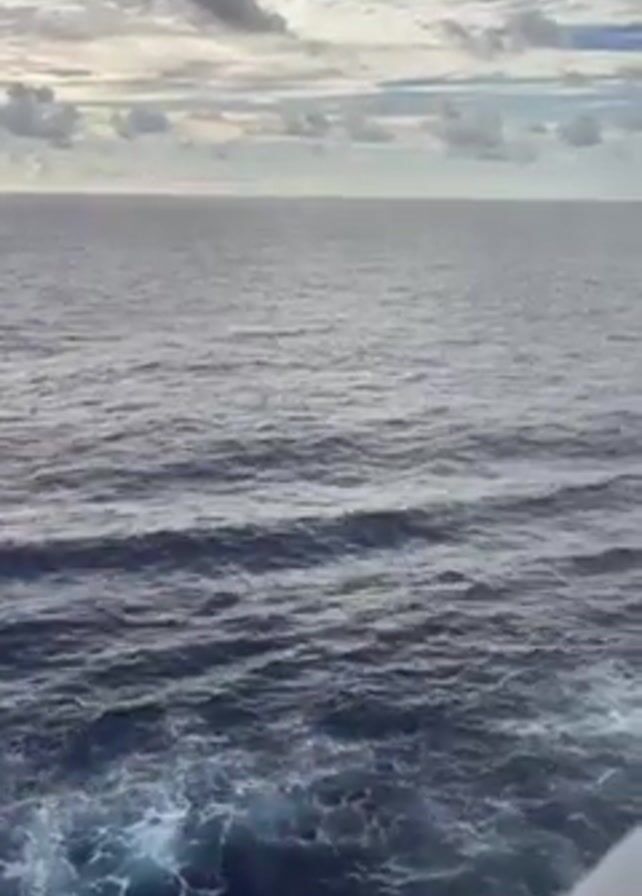 A low-angle, static shot reveals a vast, dark blue ocean under a sky filled with gray clouds. Ripples and small waves cover the ocean's surface, with patches of white foam visible near the bottom of the frame. A small, white, undefined structure is visible in the lower right corner of the frame.
