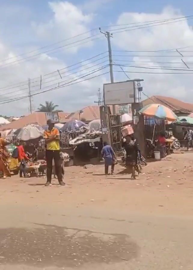 street scene in what appears to be a market area. There is a dirt road with a few parked cars and several yellow auto-rickshaws. People are walking around and some are gathered near stalls or shops. There are several buildings visible, some with corrugated metal roofs. There are power lines running overhead and the sky is partly cloudy. Overall, it appears to be a typical bustling market scene in a developing country.