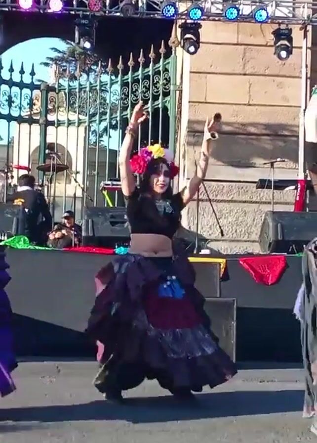 A group of costumed dancers perform on a street in front of a stage. The dancer in the center wears a black crop top, a long multi-colored skirt, face paint, and a crown of flowers. She is holding maracas and shaking them in the air. To her left, another dancer in a purple dress can partially be seen, and another dancer in a grey dress is on her right. Behind the dancers is a stage with a black backdrop, speakers, and musical instruments. A gate is behind the stage, with a building behind that. There are stage lights set up in front of the building. The street is paved.