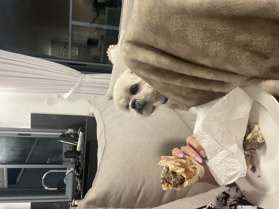 The image displays an indoor scene, likely a modern apartment in Petah Tikva, Israel, during nighttime or low light conditions. In the foreground, a person is seated on a light beige, upholstered sofa, holding a partially consumed wrap or burrito filled with ground meat and sauce. The visible hand has long, almond-shaped fingernails with a French tip and black polka dot design. A crumpled white paper napkin is held in the same hand, and a white plate below contains additional food debris. Beside the person, a small white Shih Tzu dog, wearing a blue collar, sits partially obscured by a light brown, plush blanket. The dog is looking upwards with focus towards the food item. The background reveals a kitchen area with a stainless steel gooseneck faucet above a sink, dark countertops, and cabinetry. To the right, a large glass sliding door or window, featuring a sheer white curtain tied back, reflects internal lighting and offers a dim view of an urban environment beyond.