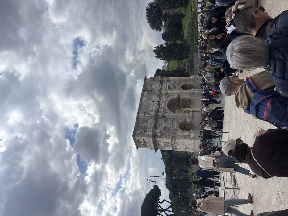 The scene is located in Rome, Italy, featuring the Arch of Constantine as the central and dominant monument. The large, three-arched stone structure, adorned with intricate sculptural reliefs, stands in the midground. A dense congregation of people, dressed in casual attire, occupies the foreground and surrounds the arch. Individuals are observed standing, walking, and sitting on ground-level steps or low stone barriers. Several people in the immediate foreground are seated, some focused on mobile devices. The environment consists of paved ground in the foreground, transitioning to green grassy slopes and dense trees, including umbrella pines, in the background and to the left. A streetlamp is visible on the far left. The sky is predominantly overcast with interspersed patches of blue.