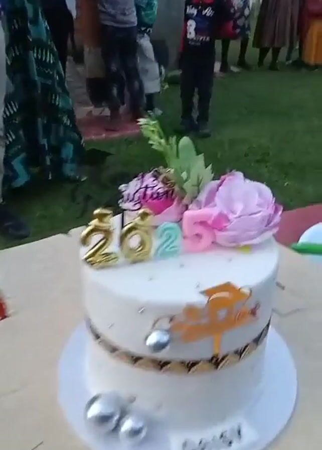 - "two-tier white cake decorated with a "Happy Graduation" topper, pink and green floral arrangements, and the numerals "2025" in gold and turquoise" by FM-RMhJC3, licensed under CC BY 4.0