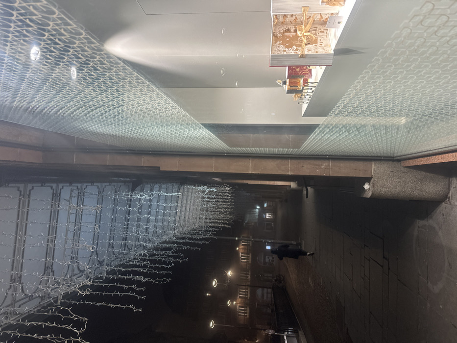 The image depicts a nighttime street scene in Strasbourg, France, characterized by a hazy atmosphere and artificial lighting. The perspective is from a partially covered sidewalk looking down a cobblestone street. On the immediate right, a large storefront window displays various items, primarily luxury perfume bottles and decorative open books, some tied with gold ribbons, on white shelves. The word "GUERLAIN" is visible on a display stand. The window glass features a patterned, semi-transparent film or etching with repetitive geometric shapes, and several internal spotlights illuminate the merchandise. To the left of the storefront, a stone column marks the start of an architectural arcade or covered walkway. Overhead, numerous strands of white LED string lights, likely seasonal decorations, are suspended, creating a bright canopy. On the cobblestone pavement beneath the arcade, a single individual, seen from behind, walks away from the viewer towards the dimly lit background. The person is dressed in dark clothing, possibly a coat. The ground appears damp or reflective. Further down the street, multiple streetlights with luminous halos pierce the haze, illuminating historical buildings with warm, glowing windows. Bicycles are partially visible parked on the left side of the street near a railing. The overall scene conveys a quiet, late-night or early-morning urban environment.