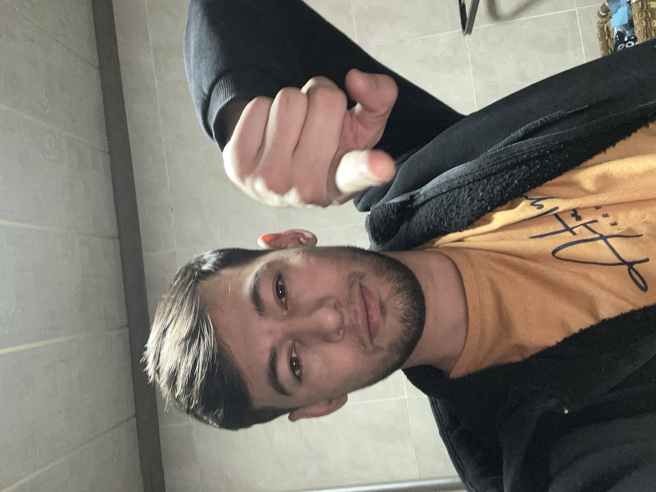 The image depicts a male individual positioned indoors in a room within the city of Yangiiul, Uzbekistan. The subject, an adult male with light skin, short dark hair styled to the right, and light facial stubble, gazes directly at the camera with a neutral expression. He wears a dark, possibly black, hooded jacket with a visible fleece lining over an orange T-shirt featuring a partially visible dark cursive graphic print on the chest. His right arm is bent, and his right hand is extended forward towards the viewer, with fingers loosely curled and the thumb pointing downwards. The background consists of light-colored tiled walls and a ceiling composed of rectangular panels. A portion of a woven basket containing blue and white objects is visible in the lower right corner of the frame.