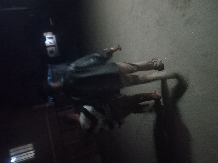 A person in a dark jacket and light-colored trousers is walking on a paved surface at night. The figure casts a long shadow. A building with lit windows is visible on the left side, suggesting an urban environment. The overall lighting is dim, and the image is slightly blurry, lending a sense of movement and darkness to the scene.