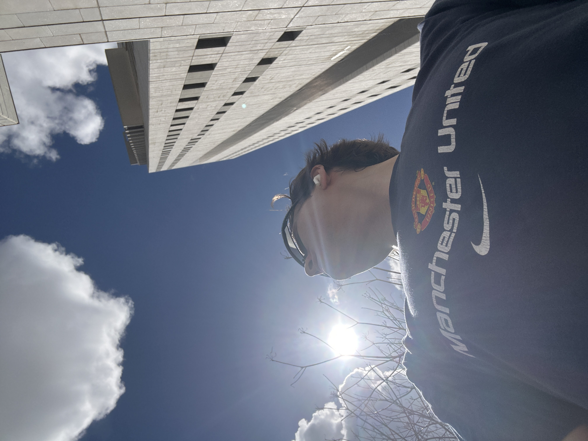 person wearing a Manchester United shirt looking up at a tall, modern building in Ramat Gan, Israel