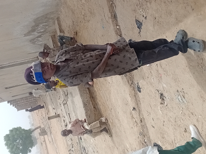 The image depicts an outdoor scene in Ayama, Nigeria, under diffused daylight, characterized by a dusty, light brown ground scattered with debris, including various plastic bags. Central to the foreground is a young male, approximately 8-12 years old, with dark skin, standing and facing directly towards the camera. He wears a long-sleeved, patterned, dark brown tunic over dark trousers, and dark grey Crocs-style sandals. A knitted cap adorns his head, featuring prominent maroon, blue, and light grey bands. His hands are clasped in front of his waist, and his face and clothing show visible dust. Behind the central figure, a concrete slab or ledge extends horizontally. To the mid-left, a young boy in a light pink/beige long-sleeved top and light trousers is seated on this concrete structure, looking towards the left. Partially obscured behind the central figure and to his left, another young boy is visible wearing a yellow and black striped short-sleeved shirt. To the mid-right, a third boy is seated on the concrete ledge, dressed in a light-colored top and dark trousers, with his right hand raised towards his head. In the mid-to-far background, a series of unrendered, light-colored concrete or mud-brick structures with vertical support elements are visible. Further back, two adult-like figures are present: one in light-colored attire and another in dark clothing, both appearing to walk or stand near the structures. To the far left background, a prominent green-leafed tree stands against a hazy, light-colored sky, consistent with a dusty or overcast atmosphere.
