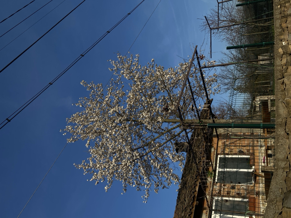 The scene presents an outdoor view in Dobri dial, Bulgaria, under a clear blue sky. A large, deciduous tree, heavily adorned with white blossoms, occupies the central frame, extending into the upper sky. Multiple dark overhead power lines run diagonally across the top right portion of the sky. To the left, a segment of a building is visible, featuring a terracotta tiled roof and two white-framed windows that reflect light. A metal framework, consistent with a pergola, is attached to the building, supporting what appear to be dormant vines. A green wire mesh fence spans the mid-ground, set behind a low stone wall composed of irregularly shaped masonry in the foreground. The background displays several leafless trees and a partially obscured secondary structure beyond the fence. The scene is brightly lit by direct sunlight. No individuals or dynamic actions are depicted.