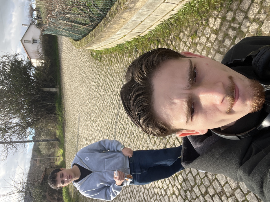 Two men pose in an outdoor selfie. The foreground man, with slicked-back hair, a stubbly beard, and headphones around his neck, looks directly at the camera. Behind him and slightly to the left, another man wearing a gray zipped hoodie and jeans stands, holding something in his hand. The backdrop features a cobblestone path, green grass, a fence, trees without leaves, and a glimpse of a white building in the distance under a cloudy sky. The orientation of the photograph is tilted to the side.