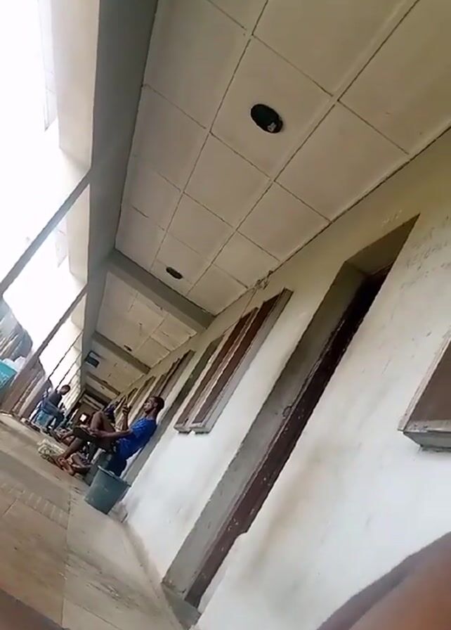 A low-angle POV shot shows a tiled hallway with several men sitting along the wall of an outdoor corridor. The walls are white, with a series of dark-brown window frames. The man closest to the camera is sitting on an upside-down green bucket, with his back against the wall. He is wearing a blue shirt and blue shorts, and is looking at his phone. Other men are also visible in the background, some on the ground and some sitting on benches or buckets. The ceiling is a grid of white tiles with recessed lights. A phone with the brand name "Tecno" is visible in the lower-left corner of the screen.