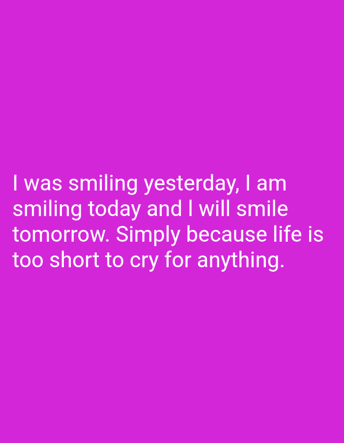 The image displays a digital graphic featuring white, sans-serif text against a solid magenta background. The text is centrally aligned and occupies the lower half of the frame. The quote reads: "I was smiling yesterday, I am smiling today and I will smile tomorrow. Simply because life is too short to cry for anything." No people, discernible objects other than text, or physical actions are present. The environment is entirely digital and abstract. The image does not depict any identifiable physical location within the city of Kaduna, Nigeria, or elsewhere.