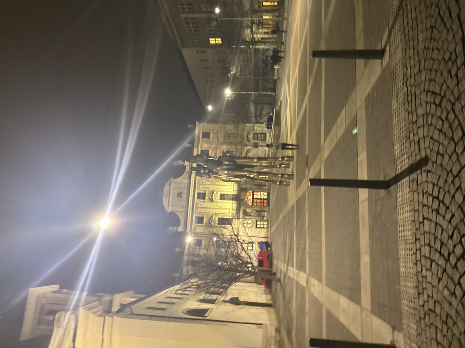 An illuminated public square at night features a large bronze statue of riders. A grand building with ornate windows sits behind the statue. The square is paved with alternating patterns of dark and light stones, and illuminated by streetlights. A tall building stands further back, its windows glowing. A red car is parked near the statue. Bare tree branches add texture to the scene.