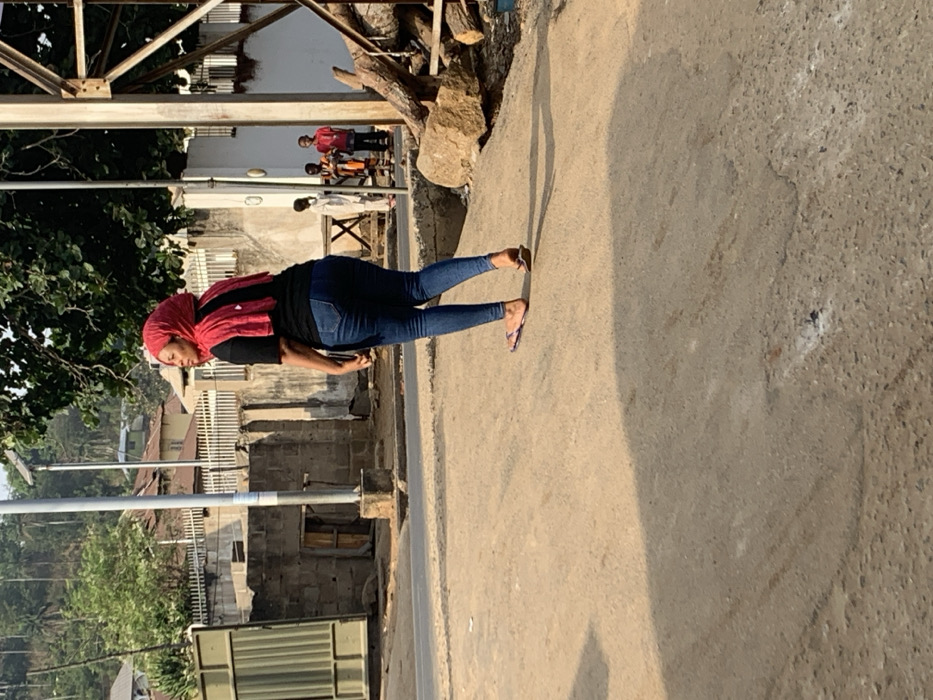 A woman wearing a headscarf and casual clothing is walking on a concrete road