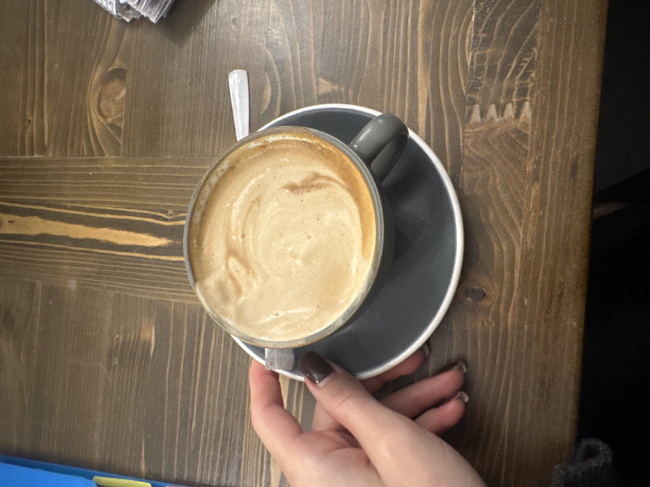 - "The image displays a close-up, overhead perspective of a beverage and a human hand on a wooden table, located in the city of Berlin, Germany" by FM-1dRiq1, licensed under CC BY 4.0