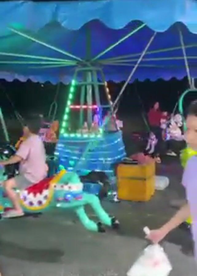 At night, a brightly lit carousel with a blue canopy and multi-colored lights on the central pillar and horses is in motion. Children and adults ride the carousel horses. The horses are green, yellow, and white, adorned with colorful spots and LED lights. Two women stand near the carousel, one wearing a white top and dark pants, the other in a lavender outfit. The carousel is set on a paved surface, and trees are visible in the background.
