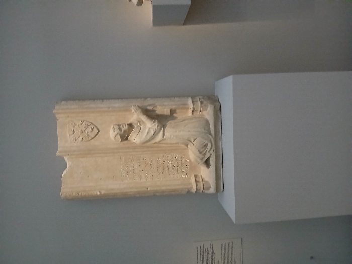 A light-colored stone relief sculpture is centrally displayed indoors, resting on a white rectangular pedestal against a plain light gray wall. The sculpture depicts a male figure kneeling in profile on his right knee, hands clasped in prayer, facing left. He is dressed in a long robe. To the figure's left (viewer's right) within the relief, a heraldic shield displaying a coat of arms is visible. To the figure's right (viewer's left), several columns of unreadable inscribed text are carved into the stone. The upper edge of the sculpture shows minor damage. To the immediate left of the pedestal, a white informational plaque with dark text is affixed to the wall. A partial view of another white display plinth is visible in the background to the right of the main sculpture. This scene is located in a museum or gallery setting in Lens, France.