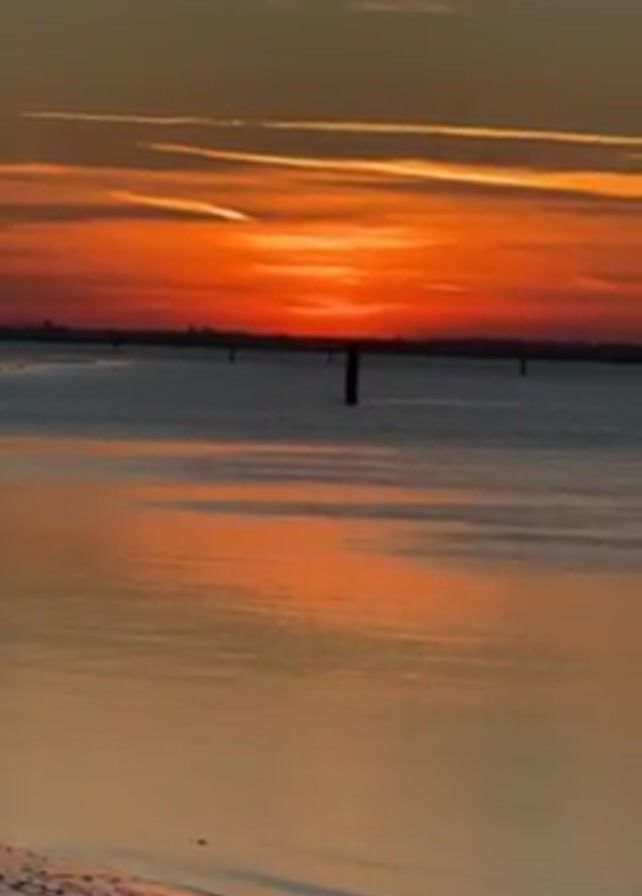 tranquil scene of a sunset over the water. The sky is painted with vibrant hues of orange and red, streaked with lines of white clouds. The sun is setting on the horizon, casting a warm, reflective glow across the water's surface. Several dark wooden posts are sticking up in the water in the distance. The foreground features a beach with dark sand. The overall atmosphere is serene and beautiful.