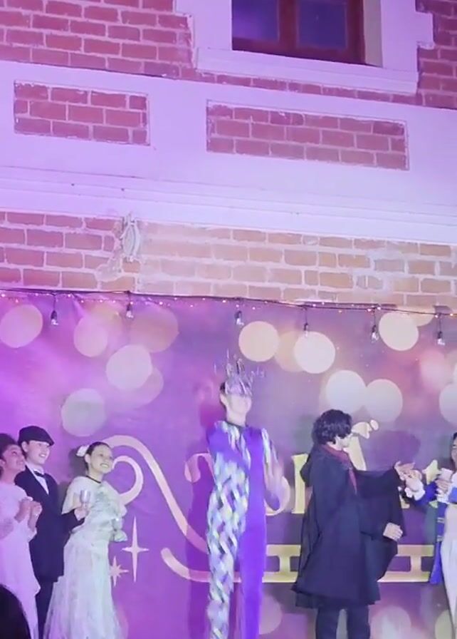 On a stage in front of a brick wall and a backdrop decorated with bokeh lights, six people stand dressed in costumes. To the left, a woman in a white gown smiles and holds a small, pale green object. Next to her is a man in a black suit, also smiling, and then another woman in a white gown holding a champagne glass, who is also smiling. In the center, a figure in a purple and blue patterned jumpsuit and a masquerade mask leaps and twirls. To the right of the central figure are two men: one in a dark robe and the other in a blue and white costume. A crowd is visible in the foreground, and purple stage lights illuminate the scene.