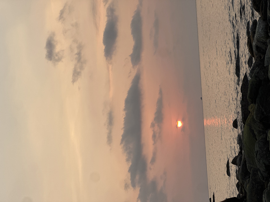 A wide shot depicts a sunset scene over the ocean in Preah Sihanouk, Cambodia. The sky, occupying approximately the upper two-thirds of the frame, displays a gradient of soft orange, pink, and pale yellow hues, interspersed with scattered dark grey and light grey stratocumulus clouds. The sun, a prominent semi-circle of intense yellow and orange light, is positioned low on the horizon in the left-center of the image, partially obscured by a cloud. The calm sea surface, visible in the lower half of the frame, reflects the sun's light in a vertical, shimmering orange-yellow path extending from the horizon towards the viewer. A small, dark-hulled vessel is faintly visible on the distant horizon line to the right of the sun's reflection. The immediate foreground, at the bottom of the frame, consists of a rocky shoreline composed of numerous dark, irregularly shaped boulders, some appearing to be covered in patches of green algae. No individuals or discernible actions are present in the scene.