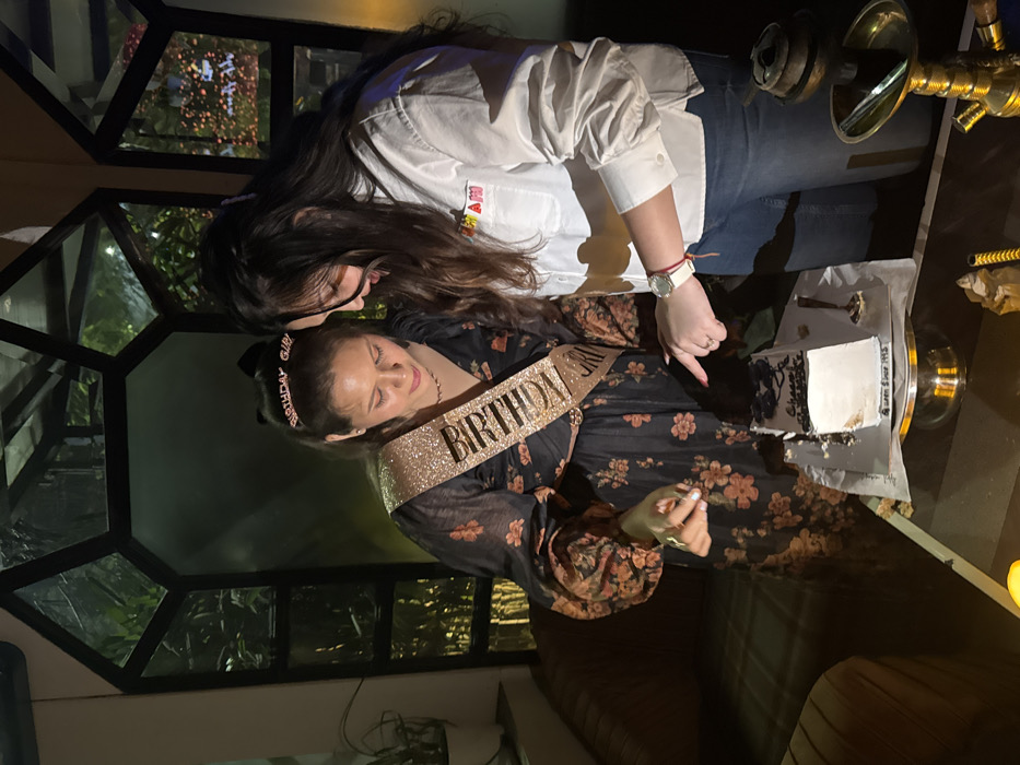 Two women celebrate a birthday. One wears a “Birthday Girl” headband and a “Birthday” sash over a dark, floral dress. She stands near a sliced cake, holding a utensil, while the other woman, wearing a white button-down shirt and jeans, stands beside her, pointing at the cake. A hookah sits on the right side of the frame and window with plants is in the background.